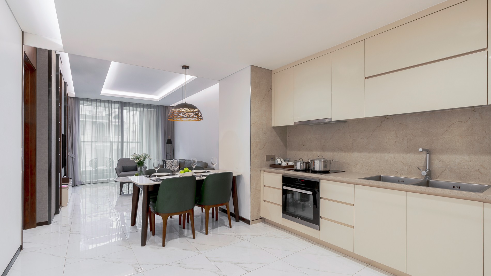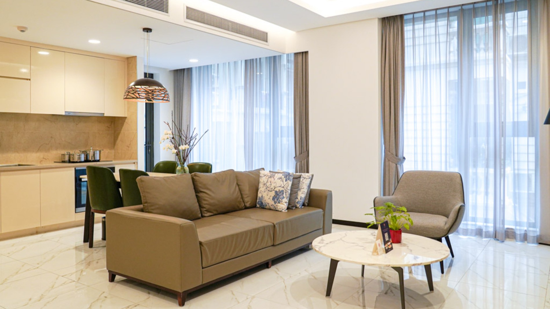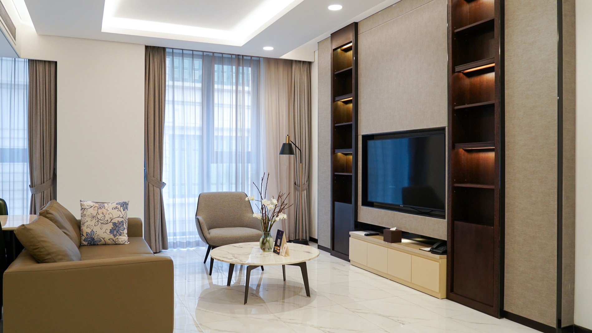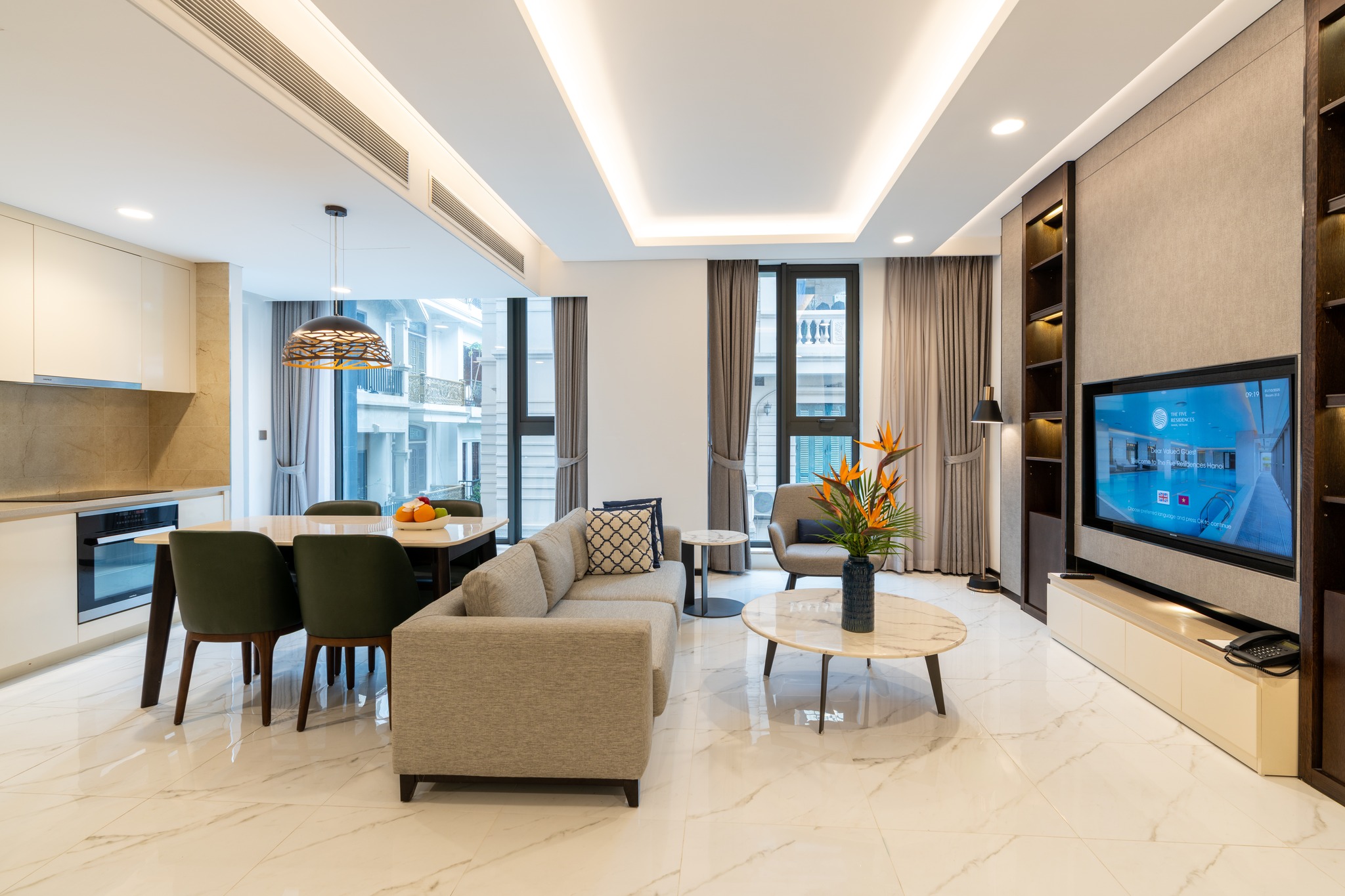 The Grand Premier Room offers a luxurious living space with a spacious, airy living room, sophisticated furnishings, and a modern, fully equipped kitchen. The bedroom and workspace are designed separately, ensuring privacy and comfort. An ideal choice for professionals, couples, or long-term guests staying in the city center.