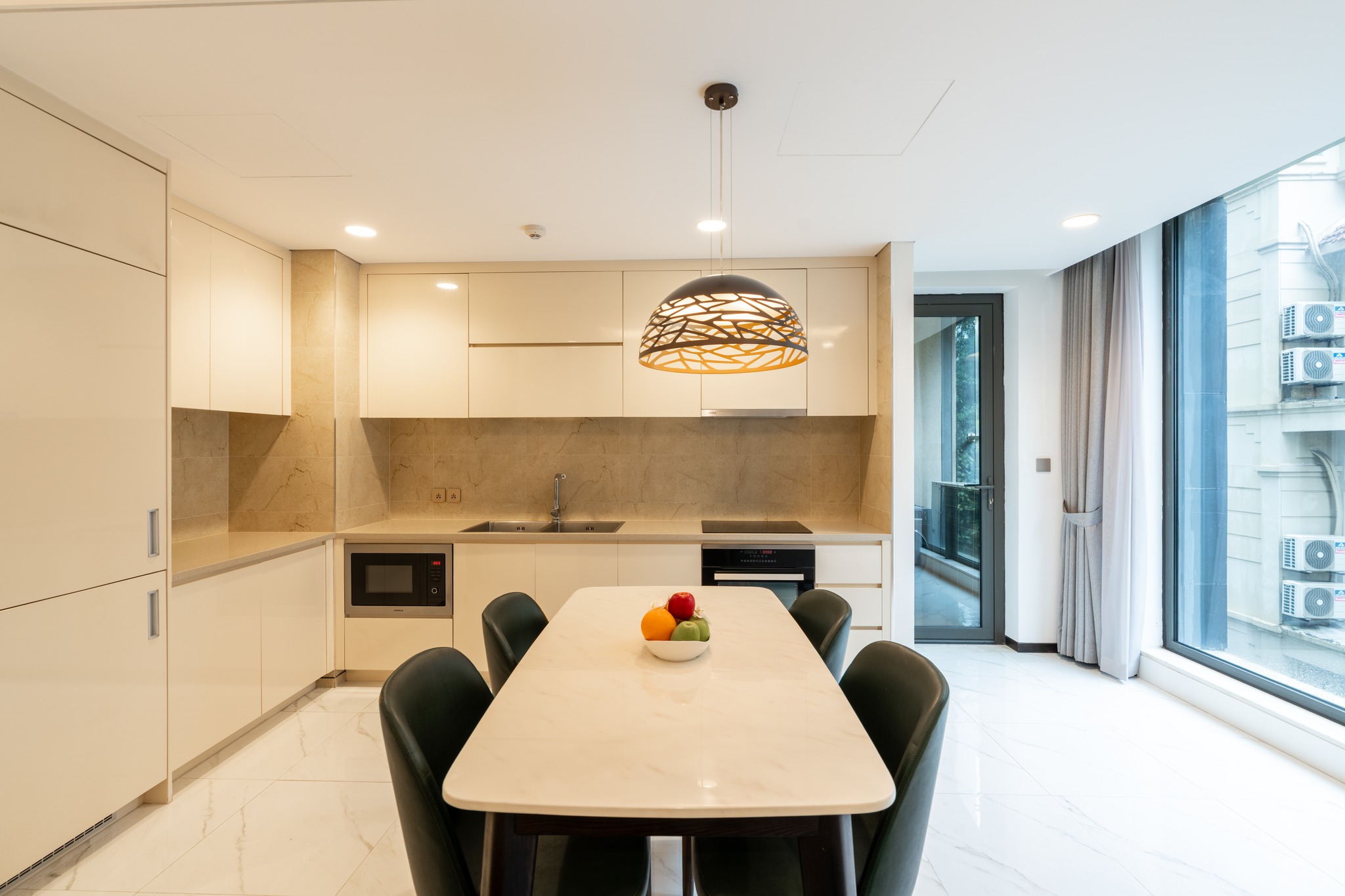 Reside in a peaceful and slow-moving corner of the city in the Three Bedroom Executive. Designed for a group of six, the serviced apartments feature a king bed in the master bedroom, a queen bed in the second and third bedroom, a spacious living and dining room, and a kitchen.