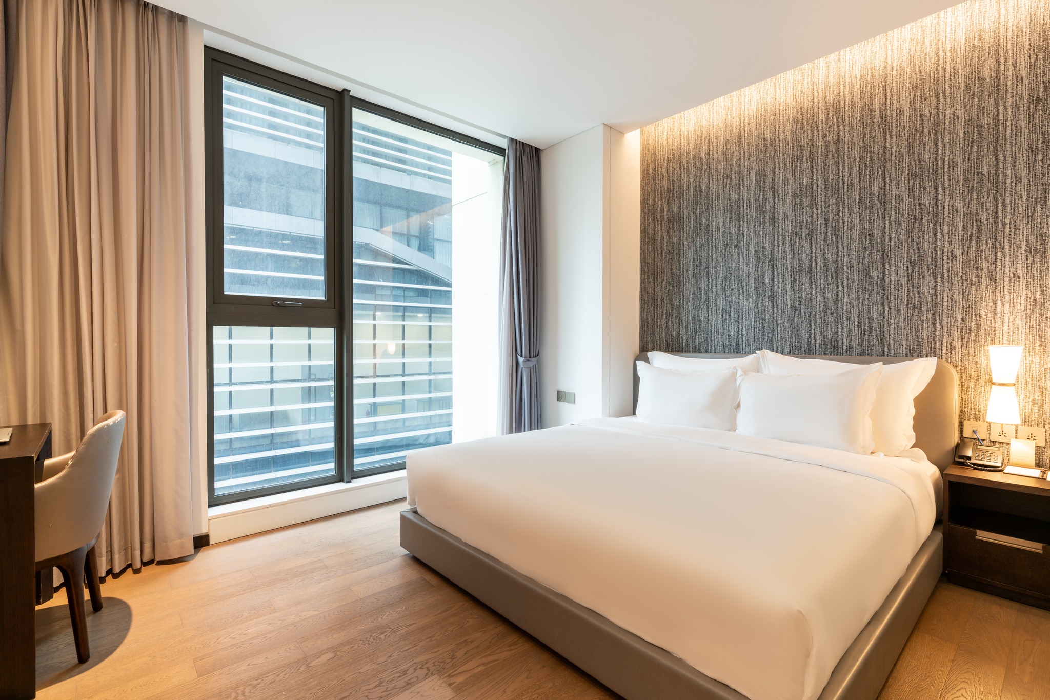 The Three Bedroom Premier apartment hotel features three elegantly designed bedrooms filled with natural light and plush bedding for ultimate comfort. A spacious living area connects seamlessly to a modern dining space, a fully equipped kitchen, and a dedicated private workspace. With inspiring city views and a prime central location, it is ideal for families or groups enjoying an extended stay.